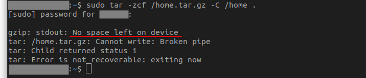 ( gzip: stdout: No space left on device )