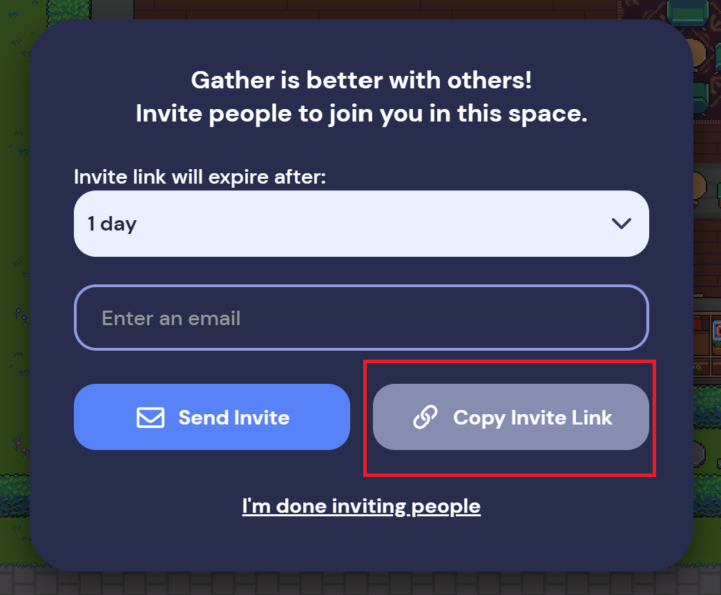 초대링크의 지속시간을 지정한 뒤 메일을 보내거나 초대 링크를 복사할 수 있다